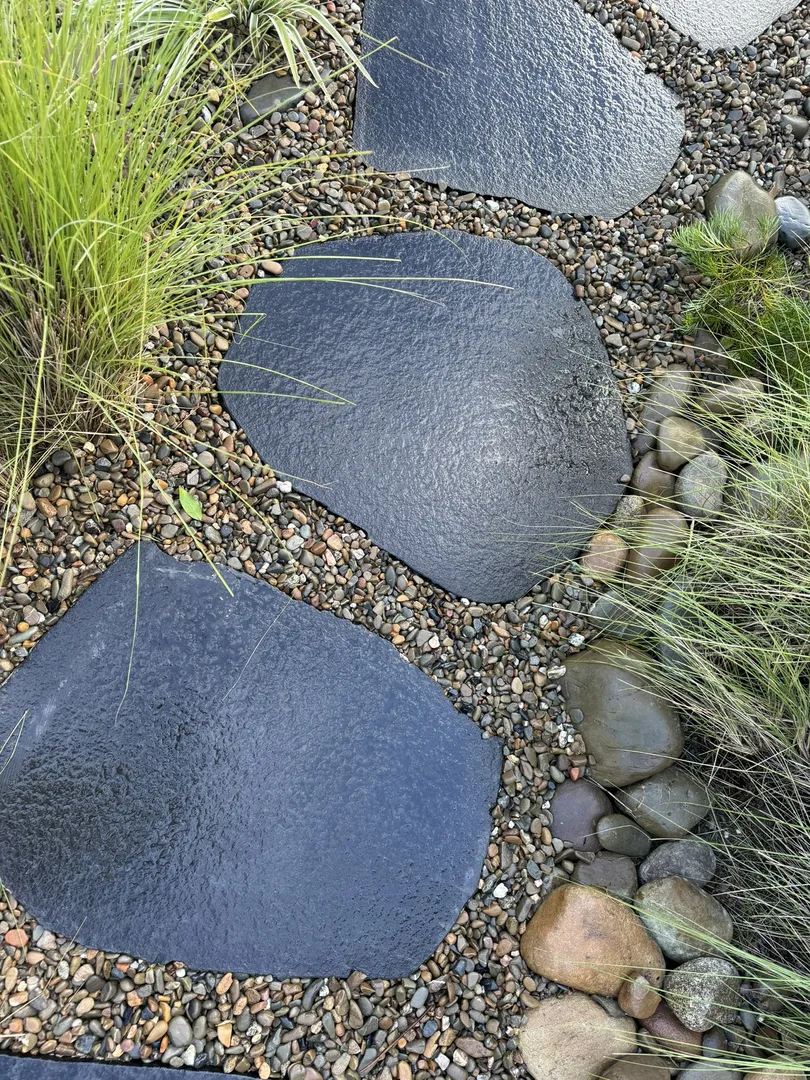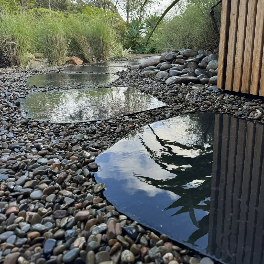 Nestled within native planting, the shower sits along a river pebble and bluestone stepping path that guides guests through the garden, creating a relaxed, sensory moment in the landscape.